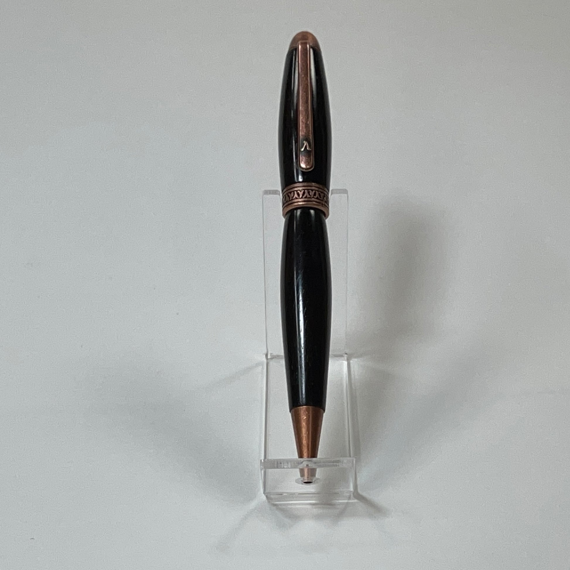 This pen that embodies classic European styling with a luxurious feel. Crafted from rich Ebony wood and complemented by a warm antique copper finish, this pen offers exceptional balance and comfort. The Artisan Made European Style Pen is a favorite among seasoned writers, thanks to its top-quality components that ensure dependability and flawless performance. This writing instrument offers the luxurious look of one of the world's most expensive pens, operating with a smooth twist mechanism and using a readily available Cross® type ballpoint refill.