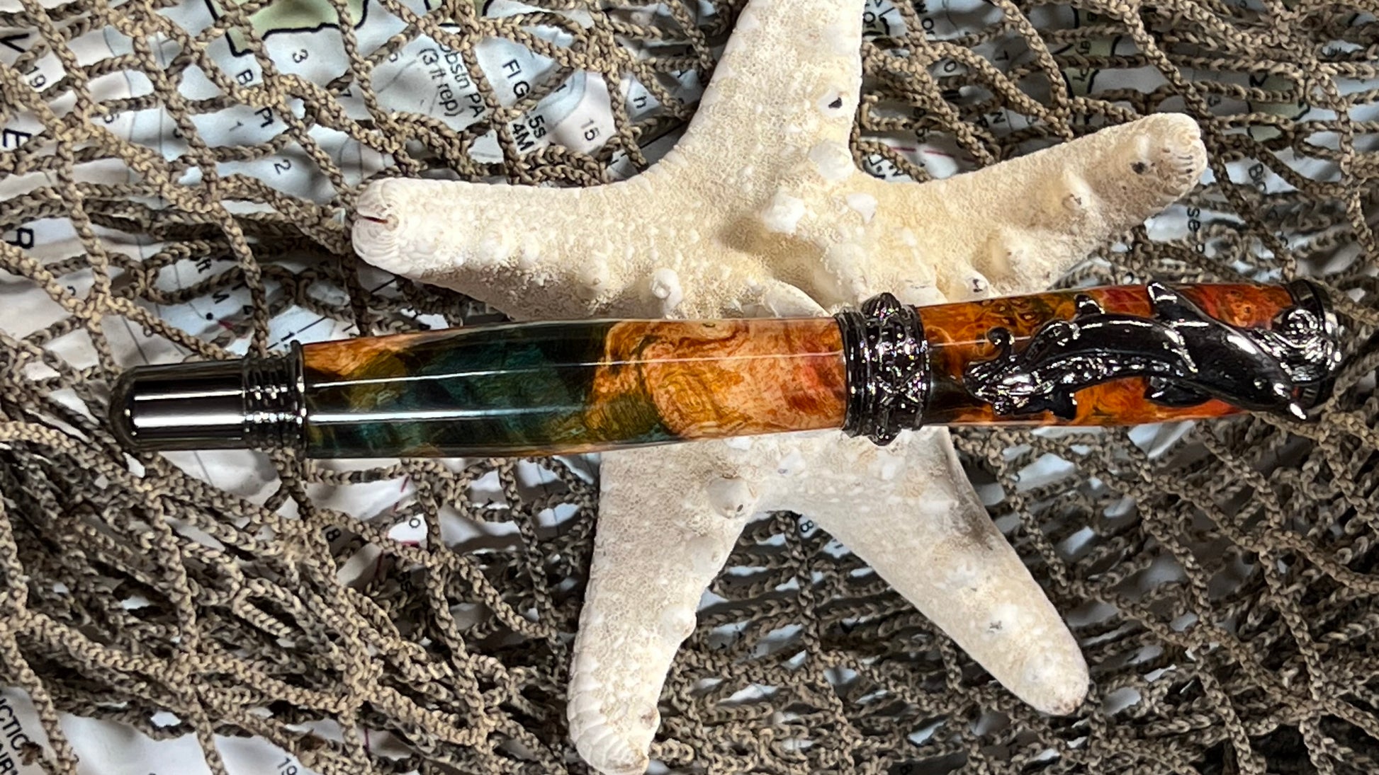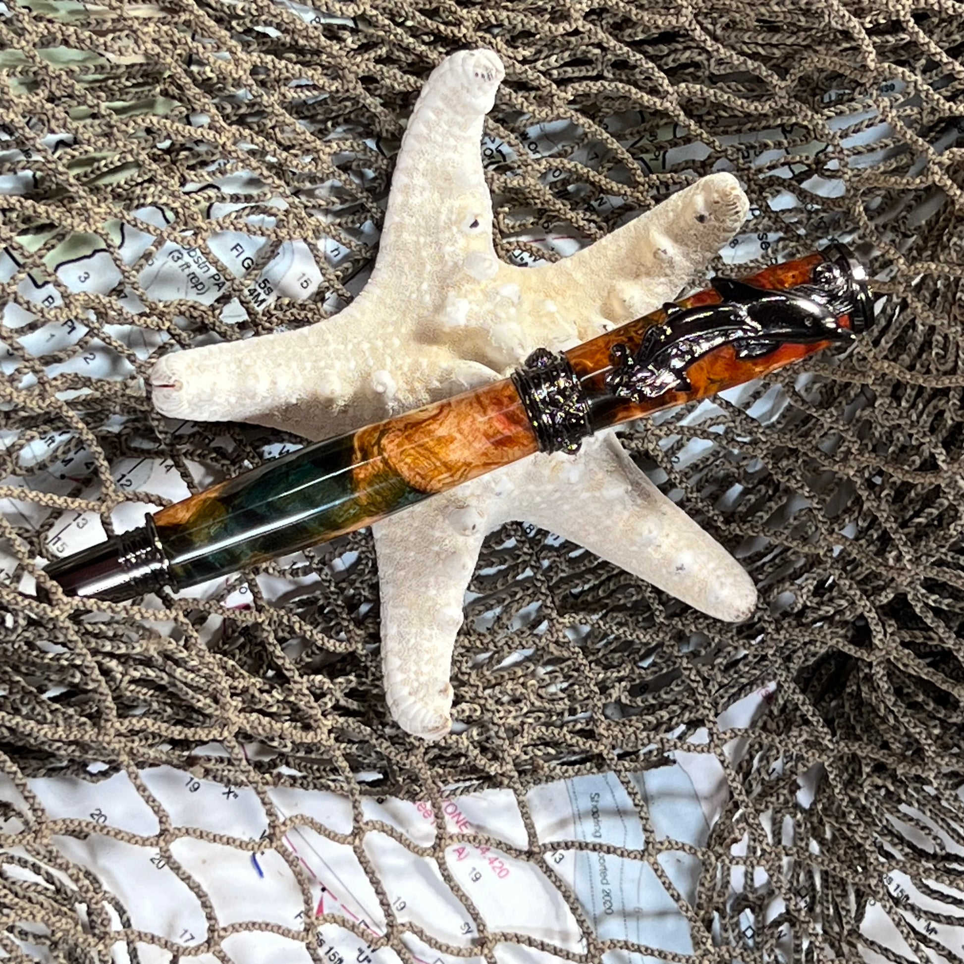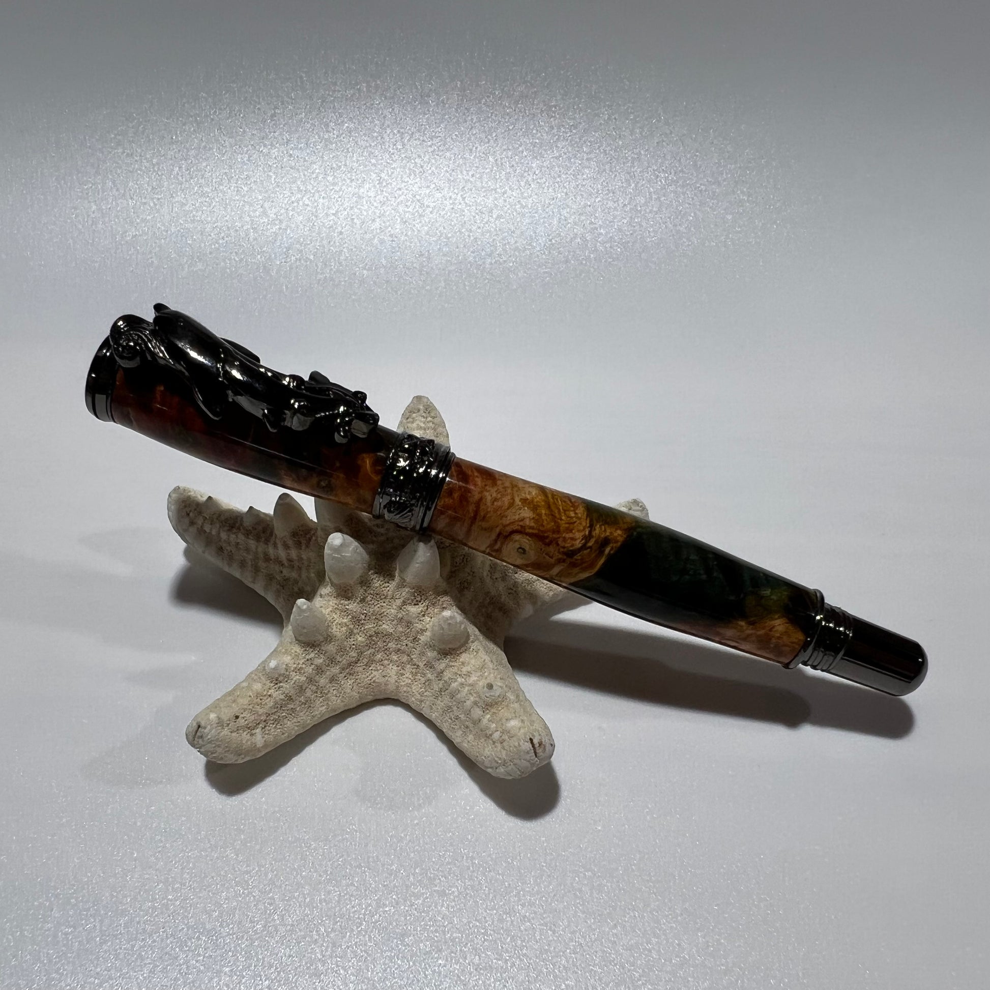 Experience the beauty of nature with our Dolphin Pen. Crafted from Maple Burl and dyed with stunning multiple colors, making it unique. The comfortable Rollerball design and gunmetal hardware make it a pleasure to write with. Make a statement with this one-of-a-kind pen.